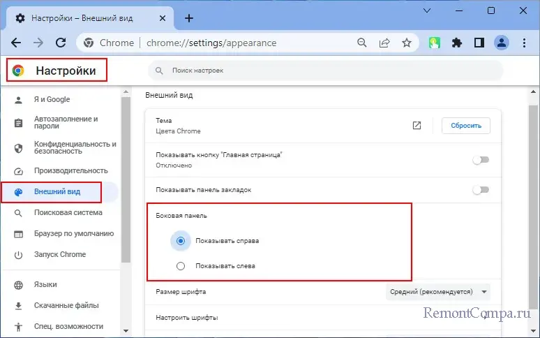 Боковая панель в Chrome по умолчанию открывается справа. В настройках браузера её можно настроить на открытие слева.
