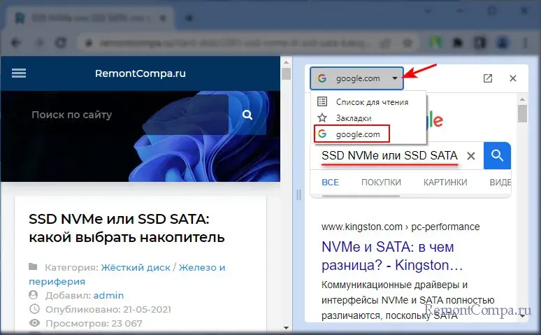 Дополнительная функция боковой панели Chrome – панель поиска Google. Появляется условно, при переходе на веб-страницу из результатов поиска Google. Функция позволяет, оставаясь на веб-странице, куда мы перешли, держать в фокусе зрения другие результаты поиска по тому же поисковому запросу на боковой панели.