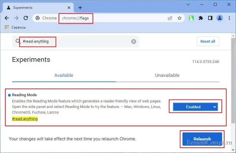 #read-anythingДля функции Reading Mode ставим переключатель в положение «Enabled». И кнопкой внизу «Relaunch» перезапускаем браузер.