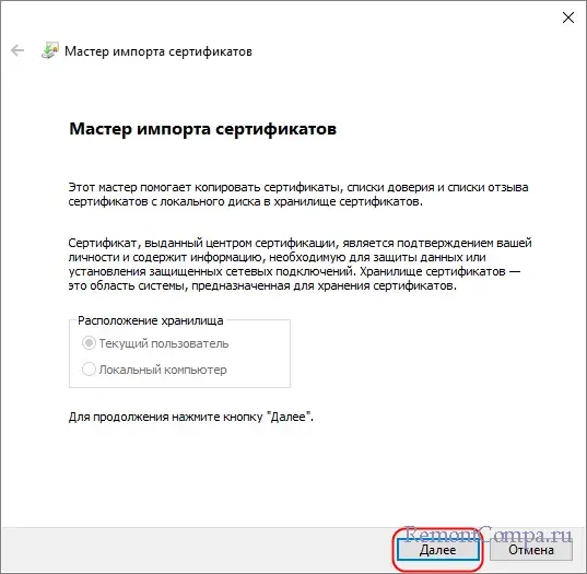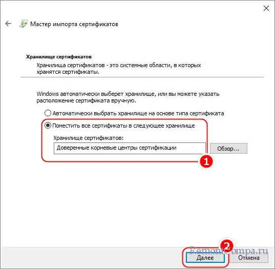 Убедитесь, что в качестве хранилища выбраны «Доверенные корневые центры сертификации», нажмите «Далее» и подтвердите установку. Аналогичным образом добавьте в систему остальные сертификаты.