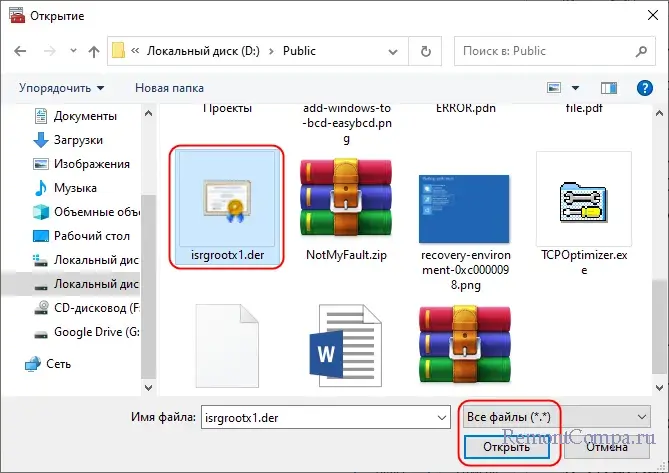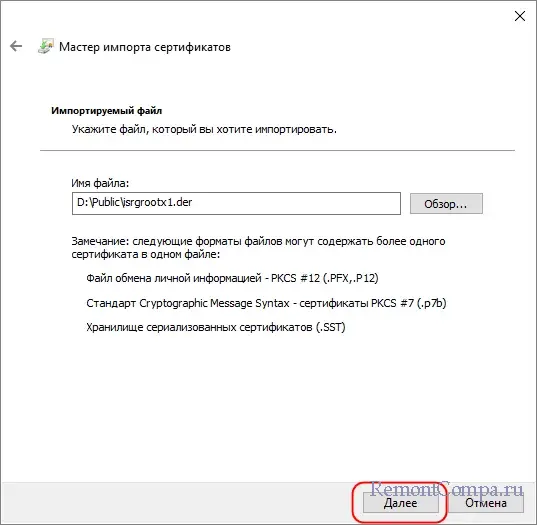 Нажав в окне мастера импорта «Далее → Обзор», укажите путь к файлу сертификата. Если файл не отображается, в окне обзора выберите «Все файлы».