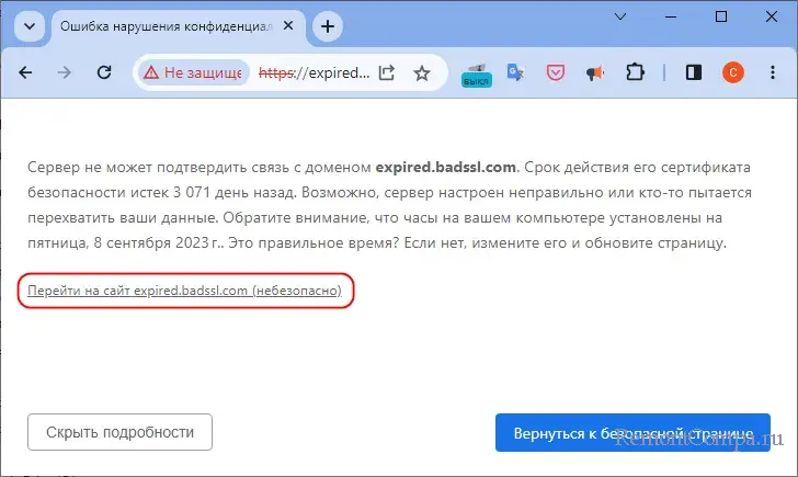 Ошибка «ERR CERT DATE INVALID» не относится к числу неустранимых, и в ряде случаев её можно обойти. Так, если на странице имеется кнопка «Дополнительно», нажмите её и кликните по появившейся ссылке «Перейти на сайт … (Небезопасно)» или кнопке «Принять риск и продолжить» – варианты в разных браузерах могут отличаться. Если ссылка или кнопка отсутствуют, попробуйте открыть сайт с другого устройства – компьютера или телефона. Если ресурс не открывается, скорее всего, дело в просроченном сертификате – проблема на стороне сервера, решение которой целиком зависит от администрации сайта.