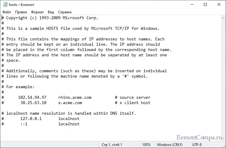 - Просмотрите в содержимое файла hosts. По умолчанию он содержит закомментированный (символом #) текст. Если hosts содержит незакомментированные IP-адреса кроме локальных 127.0.0.1 и ::1, это может свидетельствовать о вирусной активности или стороннем вмешательстве. Удалите их и проверьте систему антивирусным сканером.