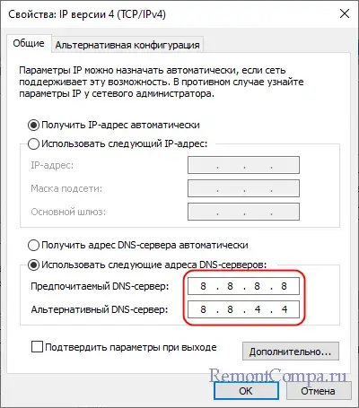 - Задайте адреса альтернативных DNS в свойствах «IP версии 4» используемого сетевого адаптера. Если вы не знаете, как заменить DNS, ознакомьтесь с нашей статьёй «Как ускорить доступ к сайтам с помощью публичного DNS».
