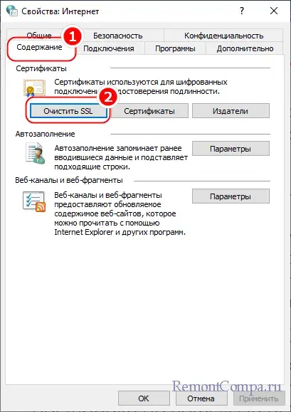 - Выполните очистку SSL. Откройте командой inetcpl.cpl апплет «Свойства браузера», переключитесь на вкладку «Содержимое» и нажмите кнопку «Очистить SSL».