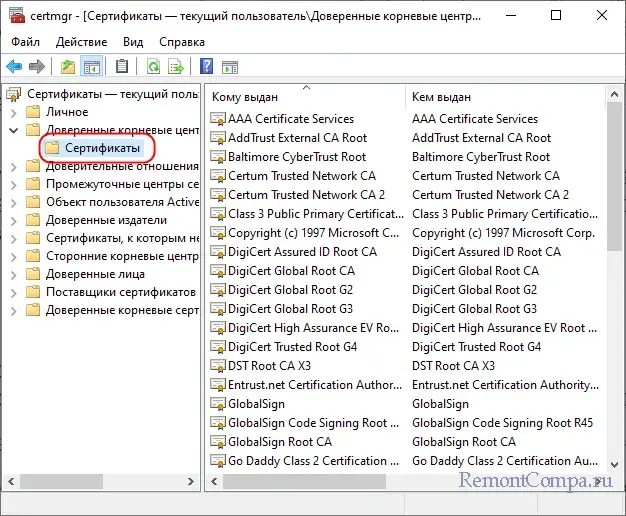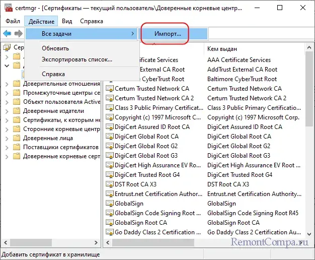Установка сертификатов особой сложности не представляет. Откройте командой certmgr.msc оснастку управления сертификатами и перейдите в раздел «Доверенные корневые центры сертификации» → «Сертификаты».
