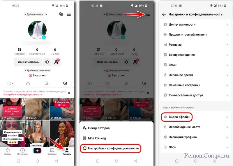 Для использования функции «Видео офлайн» в мобильном Тик Ток переключаемся на наш профиль. В меню выбираем «Настройки и конфиденциальность», далее «Видео офлайн».