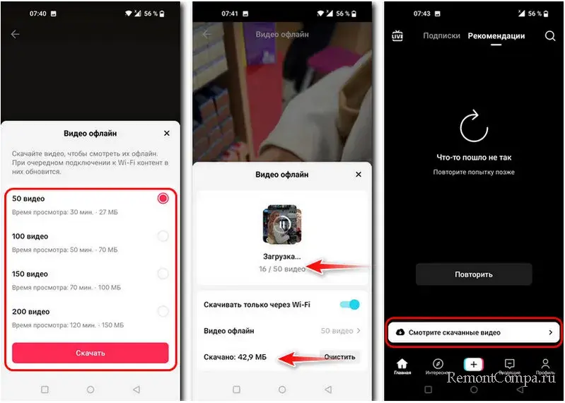 Выбираем вариант со скачиванием нужного числа видеороликов – от 50 до 200. И жмём «Скачать». Далее здесь же, в этих настройках можем получить доступ к скачанным роликам. А при отсутствии Интернета приложение Тик Ток на главной странице предложит нам просмотр скачанных видео.