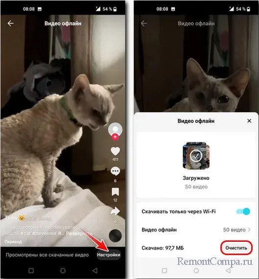 После просмотра скачанные видео можно удалить, чтобы высвободить память на устройстве. Можем нажать кнопку «Настройки» для скачанных видео, либо же можем пройти в настройки, где мы скачивали видео. И жмём «Очистить».