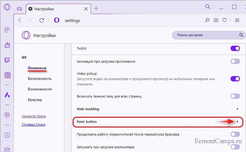 Настраивается Panic Button в настройка Opera GX. Заходим в блок Panic Button.