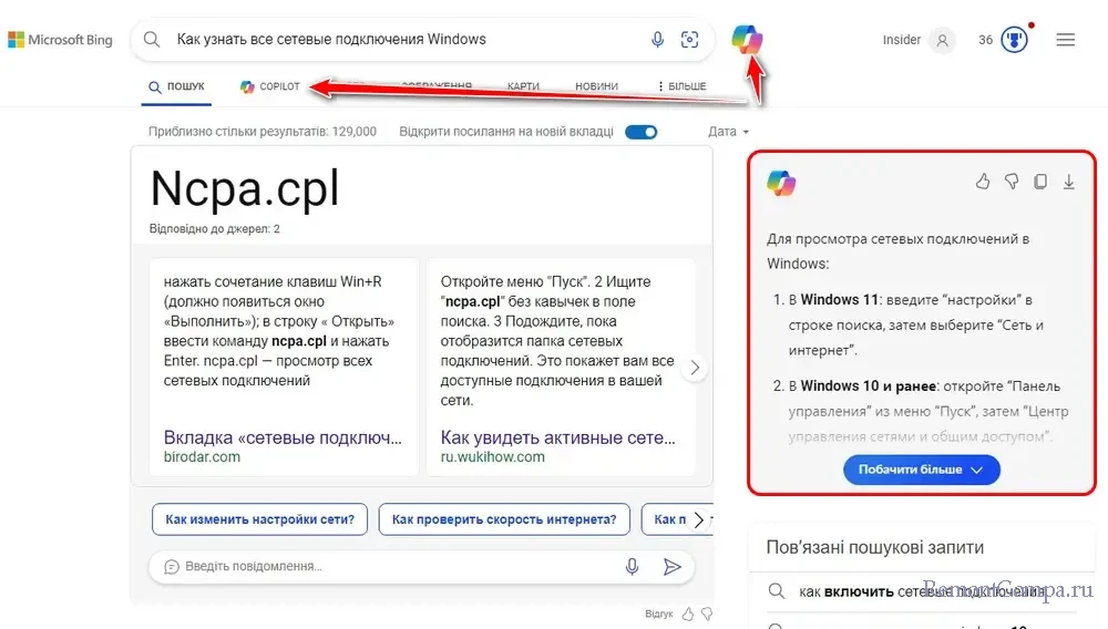 В результатах поиска Bing по введённому поисковому запросу получим ответ от Copilot рядом с блоком быстрых ответов, правее, прежде самой поисковой выдачи. Этот ответ можем скопировать, экспортировать в документ Word, PDF или TXT. И можем переключиться на чат с Copilot кнопками внизу его ответа или вверху поисковика.