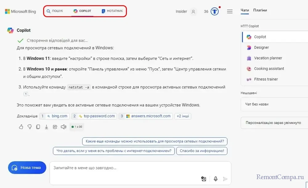 А из чата с Copilot можем перейти обратно в поиск Bing, либо же переключиться на работу с ИИ-ботом в режиме записной книжки.
