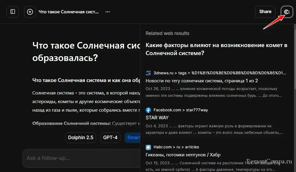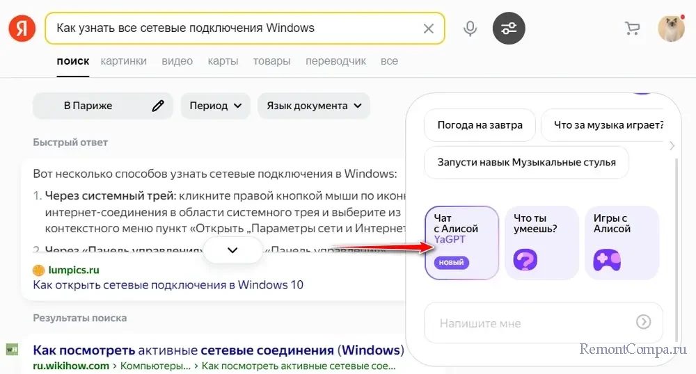 А на странице чата с ИИ-ботом по теме общения с ним можем получить поисковую выдачу на всплывающей панели.