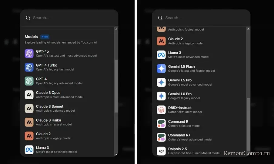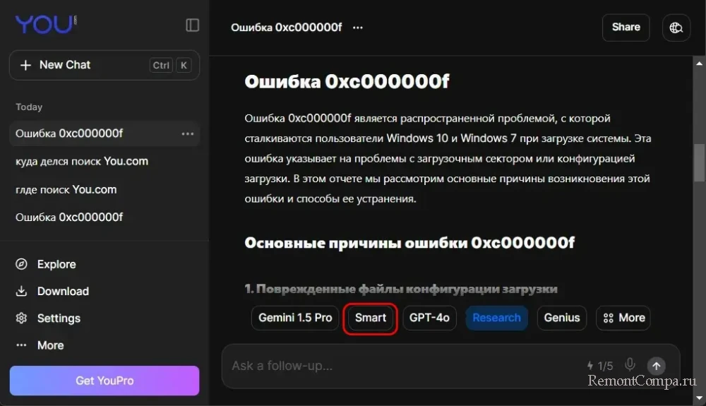 Изначально этот поисковик работал на базе только ChatGPT 3.5, кстати, о ранней реализации You.com есть обзор на сайте. Сейчас многое что поменялось в части реализации ИИ-ассистента поисковика. Ныне он может работать на базе разных языковых моделей нейросети. Соответственно, можем экспериментировать с разными моделями и в итоге выбрать максимально подходящую нам. Вот только бесплатно нам будет доступна только модель Smart.