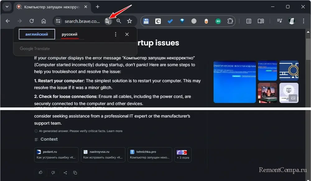 И получим прежде поисковой выдачи ответ от ИИ без дальнейшей возможности общения в чате. Ответ сопровождается отсылками на источники и кнопкой копирования. Но ответ будет только на английском, русский язык ни сам поиск Brave, ни его ИИ-ассистент не поддерживают. Ответ можно перевести с помощью браузерного переводчика.