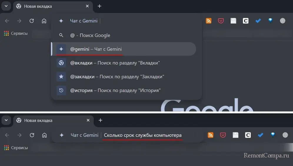 Поисковик Google на данный момент не имеет интегрированного ИИ-бота, но у Google есть отдельный веб-сервис ИИ-бота - Gemini. Что интересно, в браузере Google Chrome Gemini можно запустить прямо из адресной строки. Вводим знак «@»,на панели предложений выбираем «@gemini» и вводим запрос.