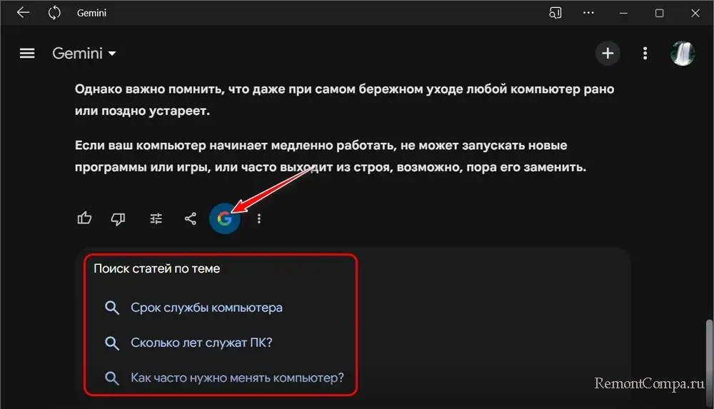Но не суть важно, каким способом мы попадём в чат с Gemini. Этот ИИ-бот в своих ответах выдаёт отсылки в поиск Google по поисковым запросам в контексте заданного ему вопроса. И, соответственно, вдобавок к полученной от Gemini информации, по этим отсылкам сможем посмотреть результаты поиска в Google. Возможно, Gemini предоставит более удачные поисковые запросы, по которым сможем получить нужную нам информацию.