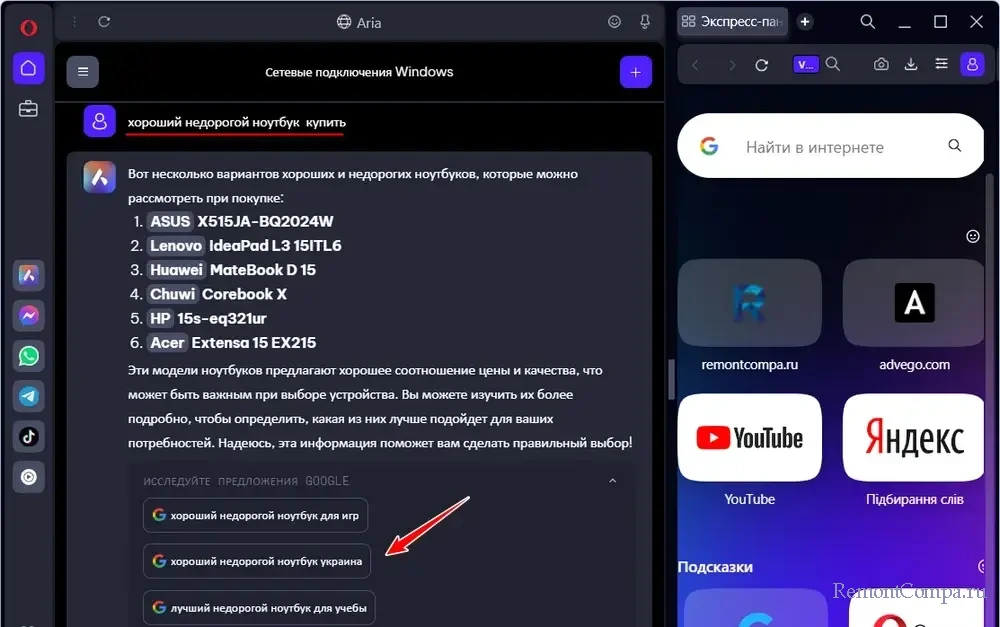 Тот же формат предоставления альтернативных поисковых запросов с отсылками в поисковик Google предлагает интегрированный в браузер Opera ИИ-ассистент Aria.