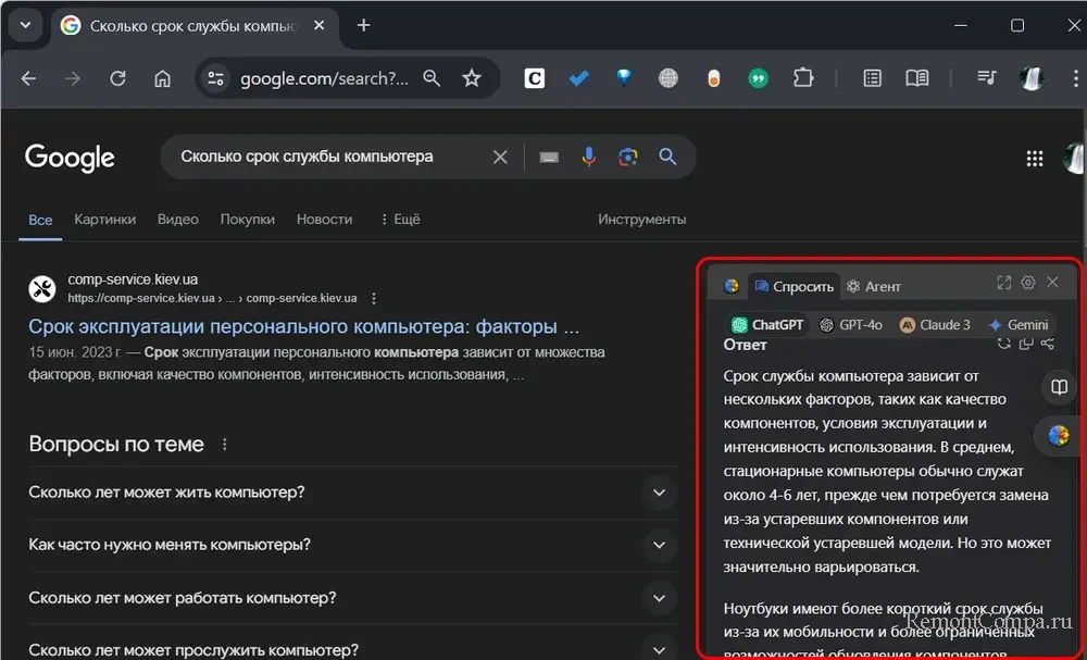 Наконец, друзья, универсальное решение для многих поисковиков и браузеров, поддерживающих установку расширений из магазинов Google Chrome, Microsoft Edge и Mozilla Firefox – расширение ChatGPT for Google. Оно интегрирует в поисковики и браузеры ИИ-бот с возможностью выбора его языковой модели нейросети. Несмотря на привязку в названии к поисковику Google, расширение работает не только с Google, но с поисковиками Bing, Yahoo, DuckDuckGo, Baidu, Яндекс и прочими. Поддержка поисковиков настраивается. Выглядит работа расширения как интеграция в поисковую выдачу панели ответа от ИИ с возможностью перейти к чату с ботом или переключиться на другую языковую модель.