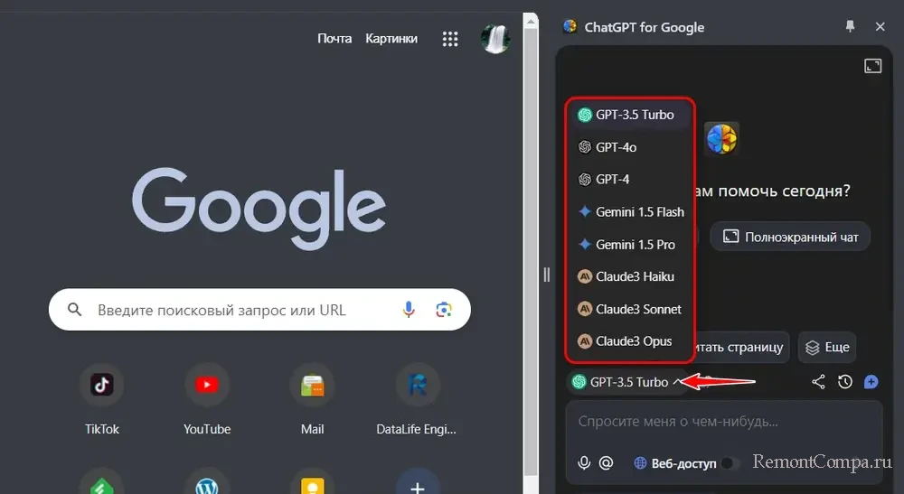 Доступных для выбора языковых моделей несколько, в частности, GPT-4, GPT-4o, Gemini 1.5 Pro. Бесплатно можно использовать GPT-3.5 Turbo и Gemini 1.5 Flash.