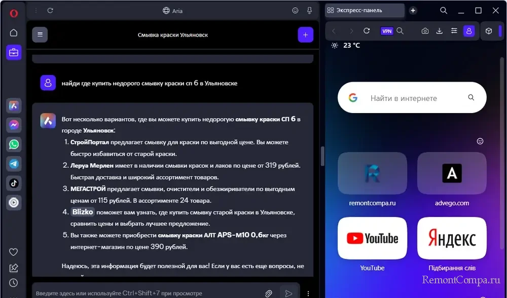 Opera – стильный и красивый браузер, настраиваемый в плане интерфейса. С интегрированными популярными мессенджерами и различными веб-сервисами. Предусматривающий разные рабочие пространства для разных задач. Есть сервис синхронизации пользовательских данных, правда, не включающий синхронизацию расширений. Есть встроенные блокировщик рекламы и криптокошелёк, поддержка жестов мышью, функция обмена контентом в десктопных и мобильных версиях Opera на разных устройствах. Предусматривает две уникальные функции – кнопу паники для мгновенного сокрытия веб-сессии и режим Lucid для улучшения видео. Яркая фишка браузера – браузерный ИИ-ассистент Aria на базе ChatGPT. Opera поддерживает расширения из собственного магазина и магазина Chrome.