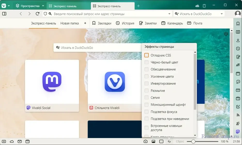 Vivaldi – это, пожалуй, самый функциональный из всех браузеров. Он с высокой степенью настройки интерфейса: предусматривает готовые и настраиваемые темы интерфейса, тёмную тему на всех сайтах, различные эффекты и настройки для веб-страниц, размещение панели вкладок вверху, внизу или по бокам окна, одновременное отображение в окне двух вкладок в горизонтальной или вертикальной компоновке, настройку стартовой страницы, браузерного меню и своих горячих клавиш браузерных функций, настройку жестов мышью и многое прочее. Позволяет тонко настроить приватность. Предусматривает встроенные модули почтового клиента, календаря, контактной книги, заметок, переводчика, RSS-ридера и RSS-граббера. Позволяет сохранять сессии работы браузера. Браузер многопрофильный. Есть сервис синхронизации пользовательских данных. Предусматривает разные рабочие пространства для разных задач. Позволяет в один клик приостанавливать свою работу - с сокрытием вкладок, приостановкой аудио и видео. Поддерживает расширения из магазина Chrome.