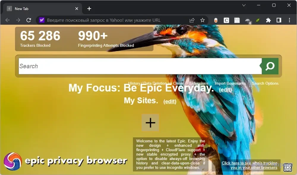 Ещё один браузер, в приоритете которого конфиденциальность и безопасность пользователей - Epic Privacy Browser. Он предельно минималистичен, предлагает только функции конфиденциальности и безопасности. Содержит даже не весь функционал самой платформы Chromium. Поддерживает расширения из магазина Chrome. Не сохраняет историю браузера. В целом про этот браузер, друзья, можно сказать так: ищущий да обрящет.