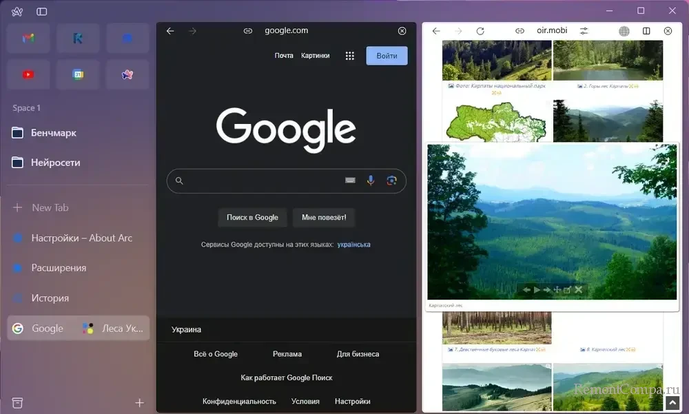 Arc – это ультрасовременный браузер в стиле минимализма. С уникальным, стильным, чистым интерфейсом. Без стартовой страницы, с боковой панелью вкладок и закладок, со всплывающей панелью поисково-адресной строки. С поддержкой эффектов прозрачности Windows 10 и 11. Со своим необычным функционалом хранения пользовательских закладок. Предусматривает отображение в окне нескольких вкладок. Браузер многопрофильный. Позволяет работать в разных рабочих пространствах. Поддерживает расширения из магазина Chrome. Есть сервис синхронизации пользовательских данных.