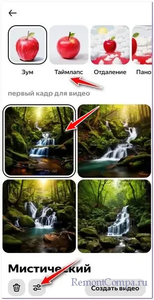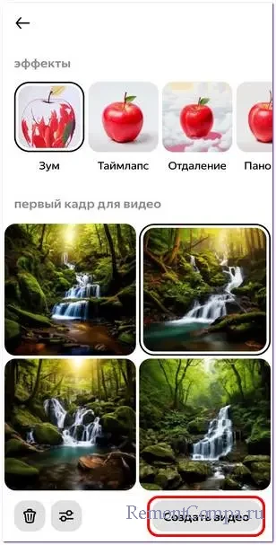 После создания нам будет предложено 4 варианта первых кадров видео. Выбираем подходящий. Далее вверху выбираем эффект анимации – масштабирование, таймлайпс, отдаление, вращение или другой. Можем нажать кнопку настроек.