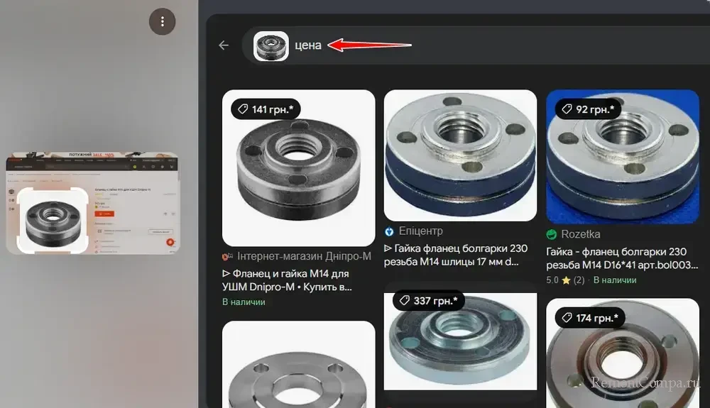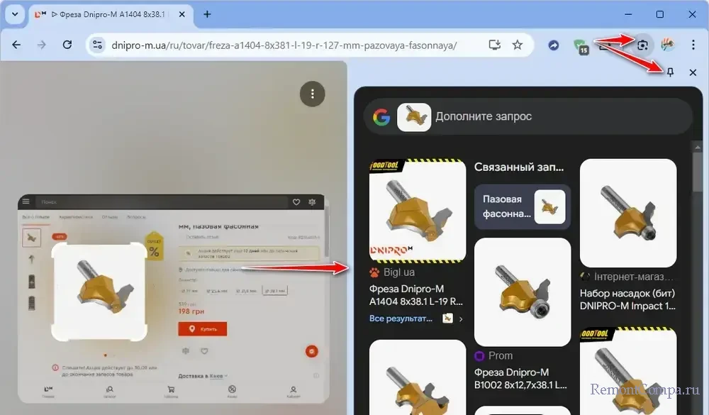 После создания скриншота откроется боковая панель браузера с результатами визуального поиска. При необходимости можем закрепить кнопку Google Lens на панели инструментов браузера, воспользовавшись кнопкой крепления на панели результатов визуального поиска.