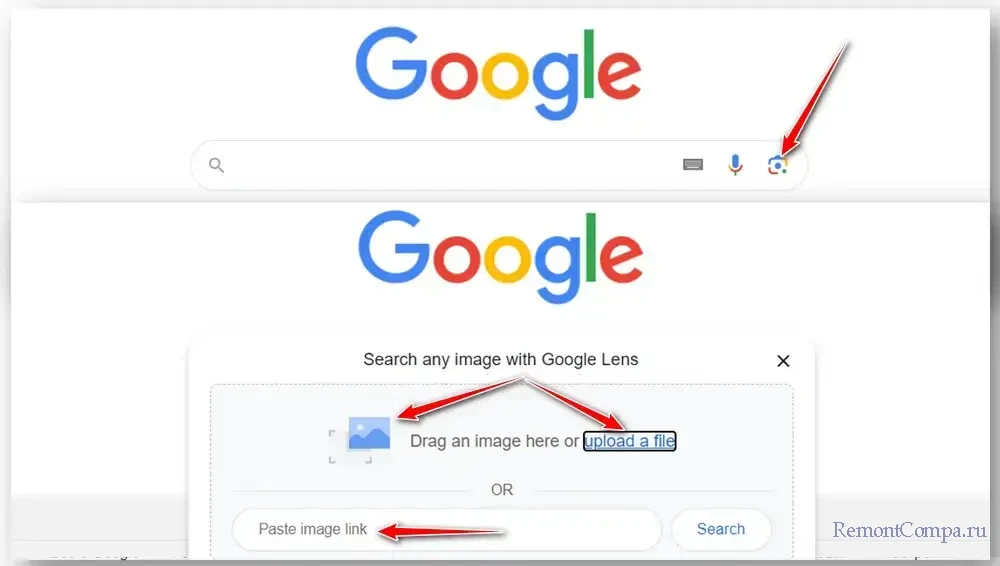 Визуальный поиск Google Lens является функцией поисковика Google. Кнопка Lens расположена прямо в поисковой строке. При её нажатии появляется форма подтягивания изображения. Можем его перетащить, загрузить с помощью окна обзора, либо вставить ссылку, если оно опубликовано в Интернете. И выполнить поиск.