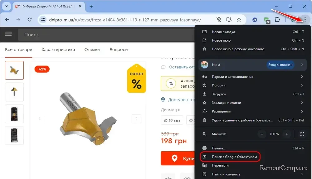 Функция Google Lens находится в меню браузера Chrome. Находясь на веб-странице с изображением искомого, выбираем эту функцию в меню.