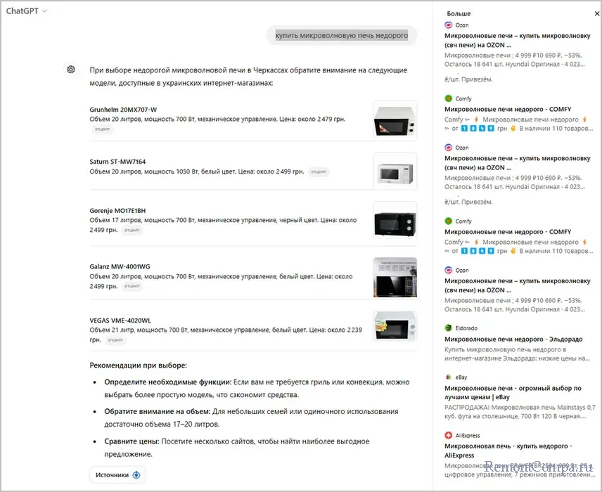 Например, введя в режиме поиска запрос «купить микроволновую печь недорого» получим в ответ несколько моделей недорогих микроволновок с основными характеристиками и ценами по данным какого-нибудь локального интернет-магазина, в соответствии с нашим местоположением. Также получим рекомендации при выборе микроволновки. При клике на ссылку «Источники» внизу ответа чат-бота откроется боковая панель со ссылками на локальные интернет-магазины, площадки товаров с рук, а также международные торговые площадки нечто еВау, AliExpress и т.п. Тогда как поисковик бы по этому же запросу выдал бы только локальные интернет-магазины.