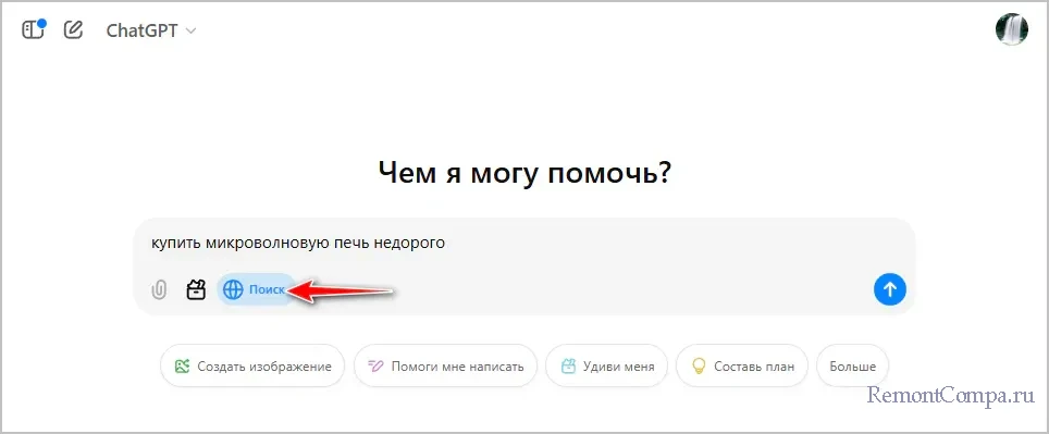 Для использования режима поиска в веб-интерфейсе ChatGPT или его официальных клиентских приложениях для мобильных и десктопных операционных систем в чате включаем кнопку «Искать в сети». И вводим вопрос или поисковой запрос.