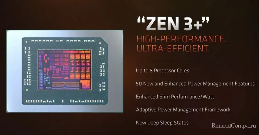 Новые мобильные Ryzen 6000 меняют на посту актуальности поколение Ryzen 5000, построенное на архитектуре Zen 3 с графикой RX Vega 8. Сами же Ryzen 6000 созданы на архитектуре Zen 3+ с кодовым названием Rembrandt, являющей собой улучшенную архитектуру Zen 3. Zen 3+ оптимизирована для большей производительности и лучшей автономии работы портативных устройств. Оптимизированная архитектура обеспечивает новые режимы низкого энергопотребления и адаптивное управление электропитанием, что позволит устройствам работать дольше без подзарядки.