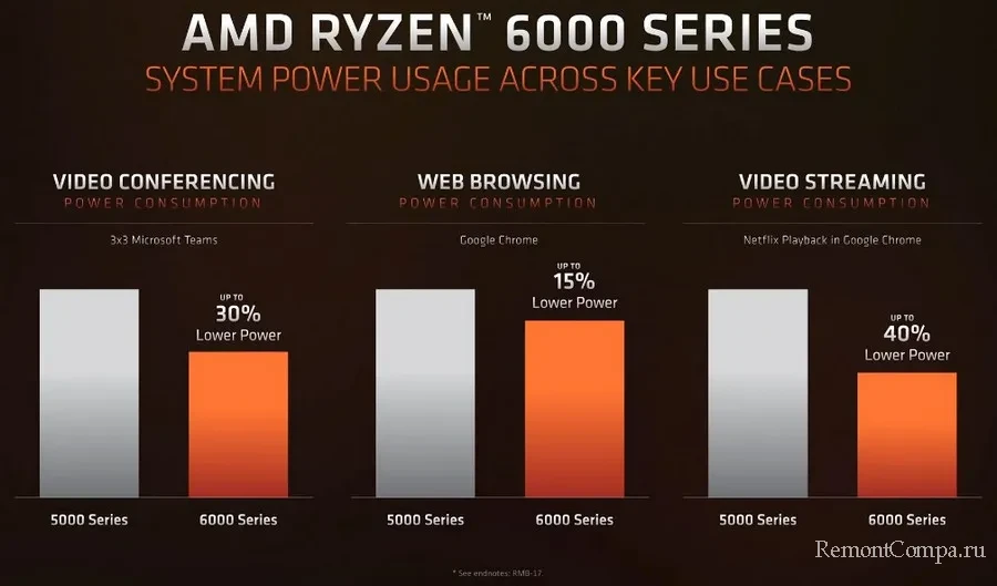 Энергоэффективность новых Ryzen 6000 по сравнению с Ryzen 5000 улучшилась на 40%. В частности, для процессоров U-Series заявлена автономная работа - до 24 часов воспроизведения видео.