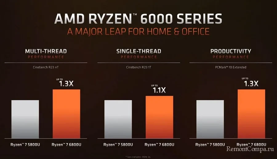 На примере сравнения представителя из серии 6000 Ryzen 7 6800U и аналога из серии 5000 Ryzen 7 5800U AMD показала преимущества первого в синтетических тестах производительности. Ryzen 7 6800U оказался эффективнее в многопоточном тесте Cinebench R23 в 1.2 раза, в однопоточном Cinebench R23 - в 1.1 раз, в комплексном тесте PCMark 10 - в 1.3 раза.