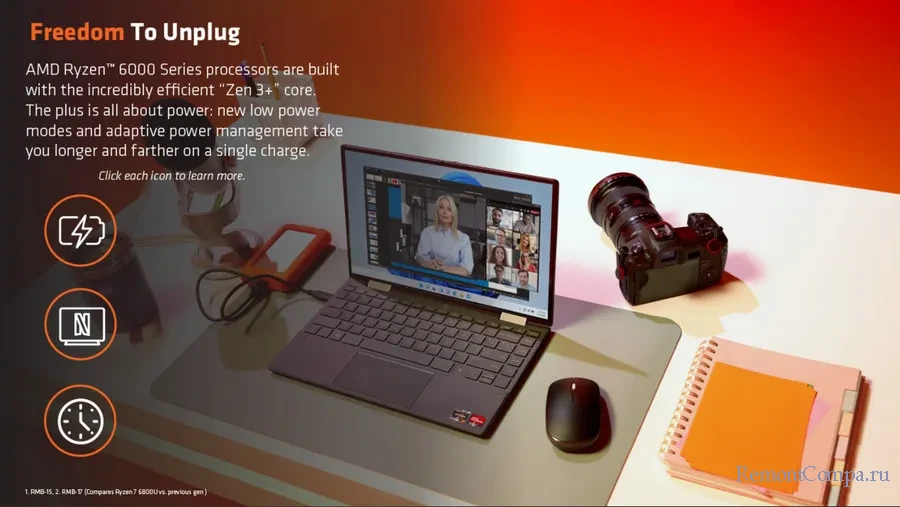 Мобильные Ryzen 6000 – это самые быстрые на сегодняшний день мобильные процессоры AMD. Их преимущества компания представила на фоне мобильных предшественников Ryzen 5000. Новинки на 30% быстрее в задачах видеоконференцсвязи, на 15% быстрее в задачах веб-сёрфинга, на 40% быстрее в задачах воспроизведения потокового видео.