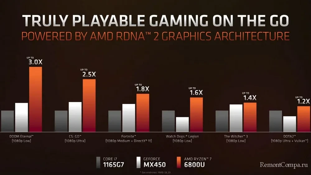 Наглядно преимущества Radeon 600M AMD показала на фоне дискретной видеокарты начального уровня GeForce MX450 и встроенной графики Intel Iris X в составе процессора i7-1165G7. На фоне этих двух Radeon 600M в отдельных играх при настройках 1080p получает преимущество максимально в 3 раза.
