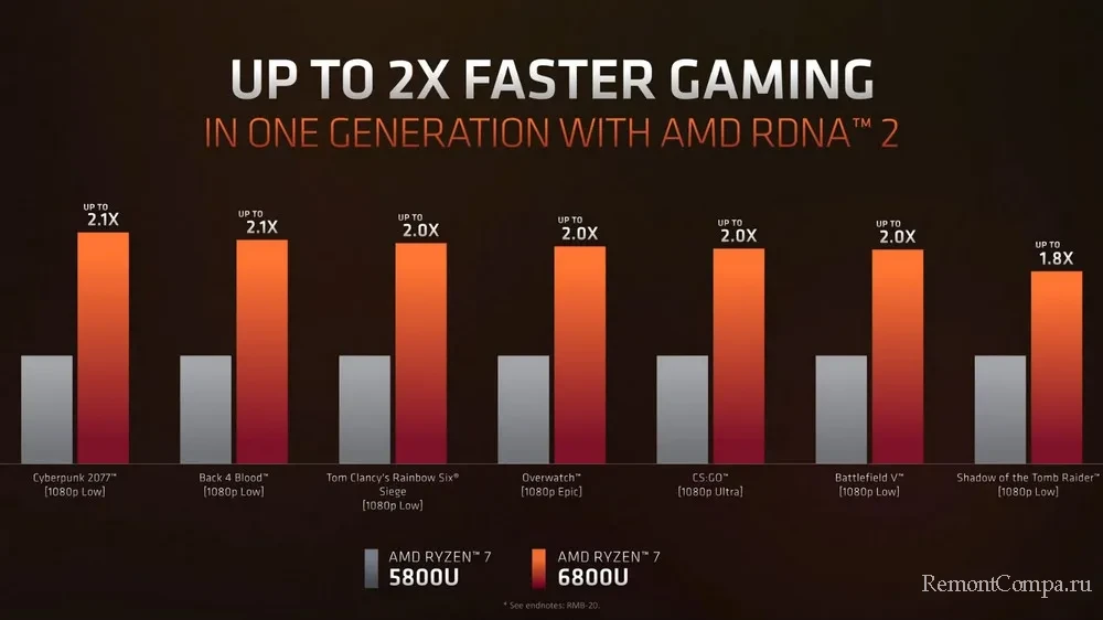 Преимущество новой графики Radeon 600M на фоне старой Radeon RX Vega 8 предоставилась честь продемонстрировать упомянутому Ryzen 7 6800U в сравнении с предшественником Ryzen 7 5800U. Новинка выигрывает в отдельных играх при настройках 1080p в производительности максимально более чем в 2 раза.