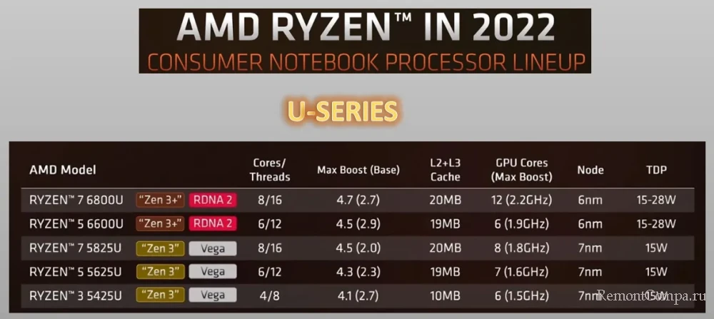 - U-Series – процессоры с базовым TDP 15-28 Вт. Это энергоэффективные модели Ryzen 5 и 7 с допиской в конце названия модели суффикса U. Из нового поколения Ryzen 6000 в U-Series представлены только две модели Ryzen 7 6800U и Ryzen 5 6600U. Столь скудный перечень U-Series AMD решила разбавить процессорами-предшественниками Ryzen 5000, добавив туда тройку моделей Ryzen 3, 5 и 7. Но не просто добавив, а обновив эти модели в части увеличения кэш-памяти L3. Представители U-Series – это процессоры для сложных задач, но энергоэффективные, с длительной автономностью.