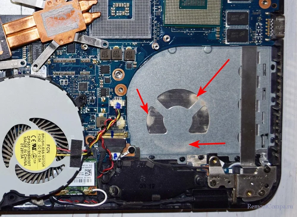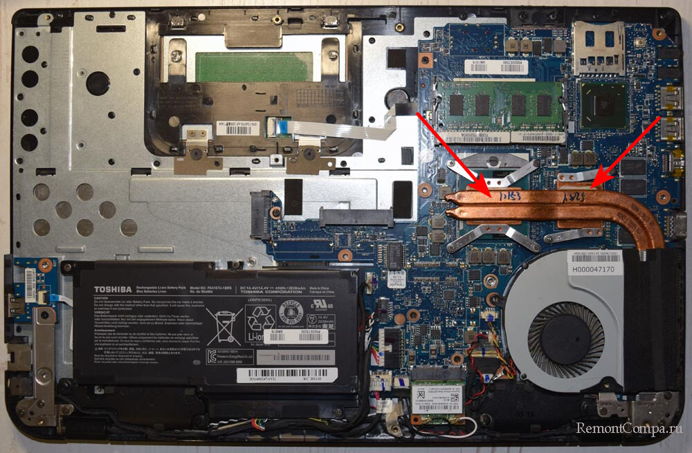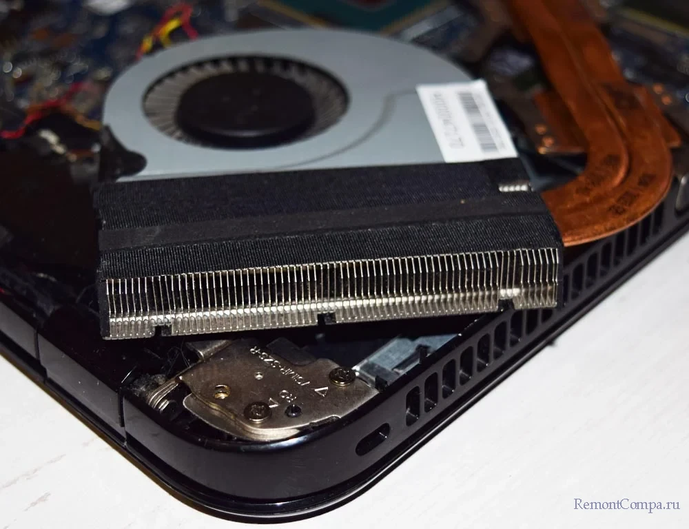 Видим отводящие излишнее тепло термотрубки, к которым крепятся два небольших радиатора, охлаждающих графический чип (видеокарту) и процессор.