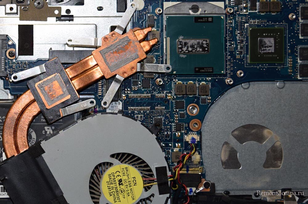 Снимаем систему охлаждения ноутбука - вентилятор с термотрубками и видим, что термопаста на радиаторах, а так же на графическом чипе и процессоре высохла, её нужно будет заменить.
