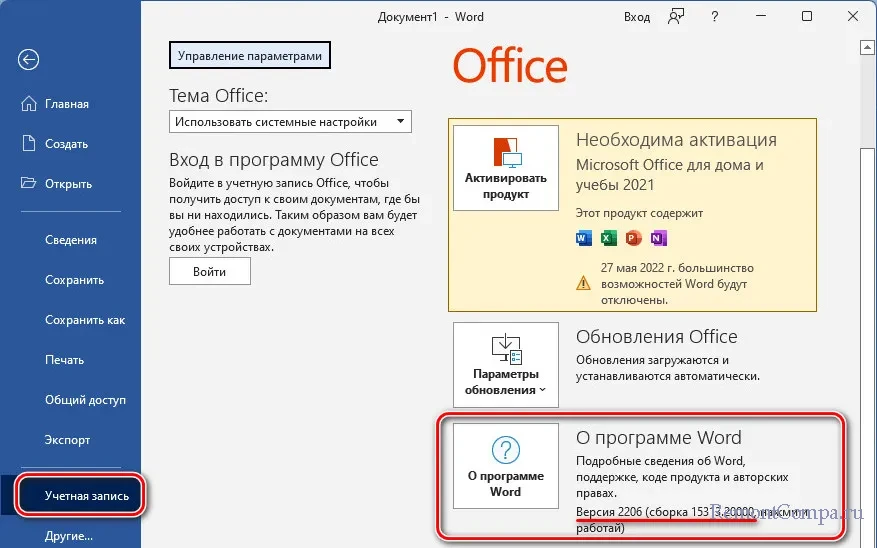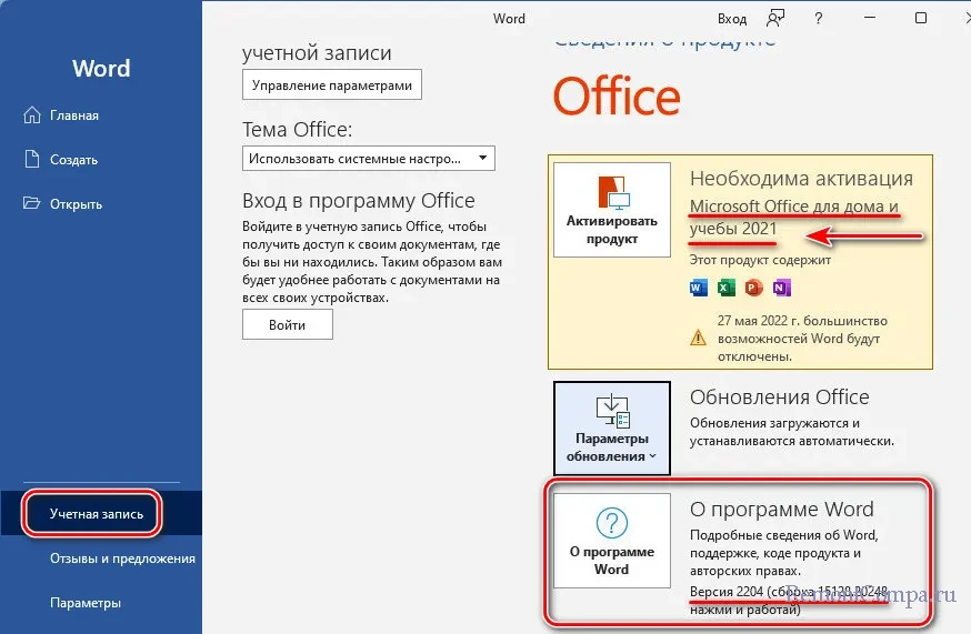 Если же мы используем Office 2021, также заглянем в раздел «Учётная запись». И посмотрим номер версии и сборки пакета.
