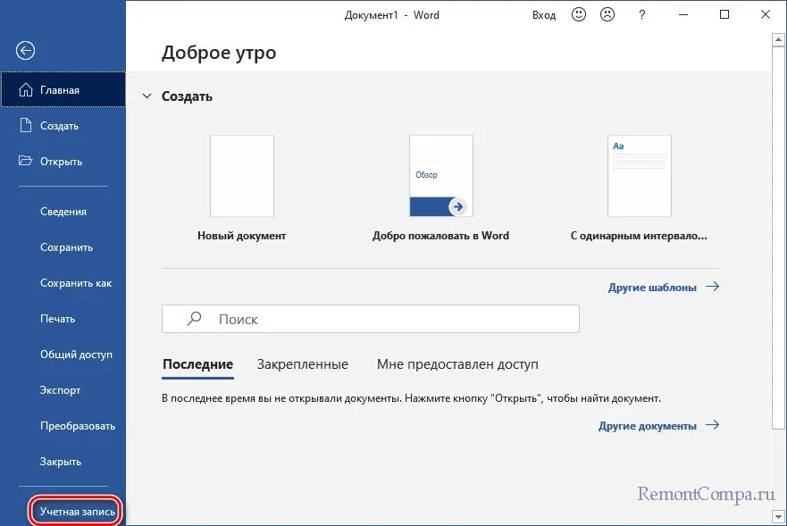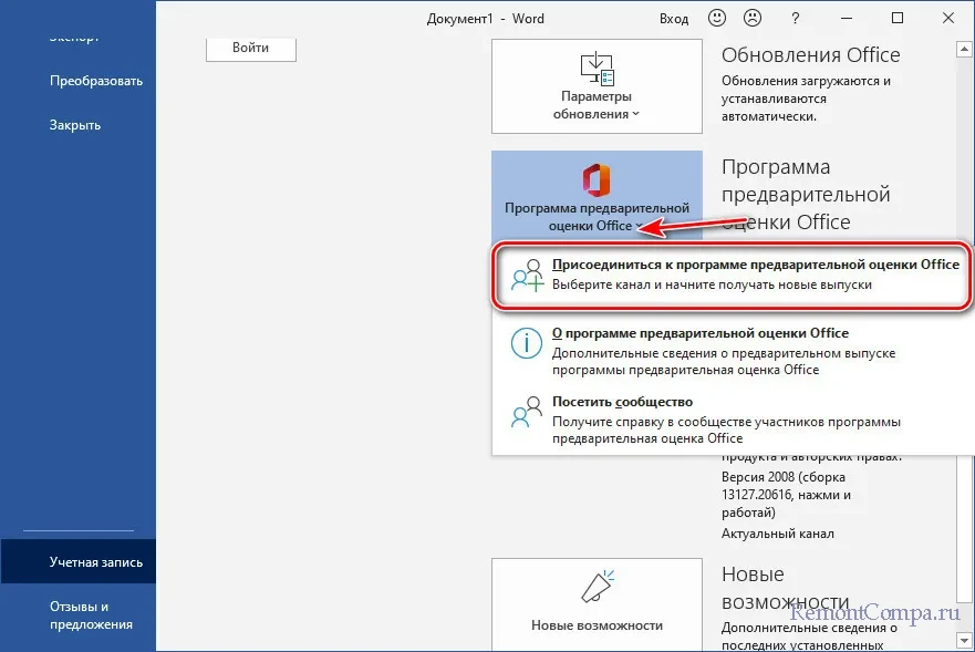 Официально участие в инсайдерской программе происходит следующим образом. В любом из приложений Microsoft 365 жмём меню «Файл», идём в раздел «Учётная запись».