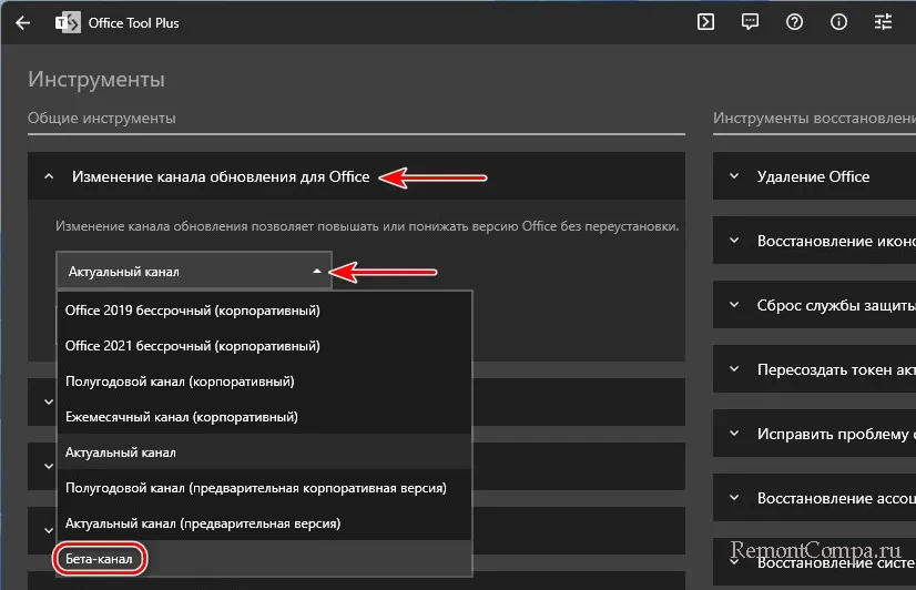 Здесь нам нужен блок «Изменение канала обновлений для Office». Раскрываем его. По умолчанию у нас будет актуальный канал. Мы же выставляем бета-канал.