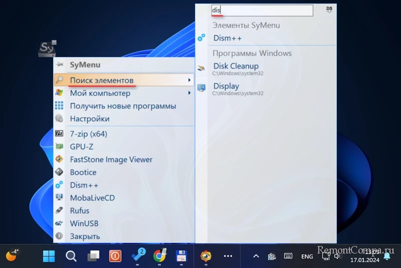 А запустить из меню SyMenu можно много чего. Это любые объекты компьютера – системные функции и настройки, установленные и портативные программы. Для запуска всего этого в меню программы есть пункт «Поиск элементов». Вводим начальные буквы искомого и выбираем его в предложениях поиска.