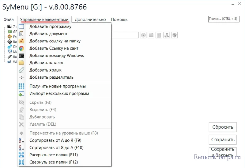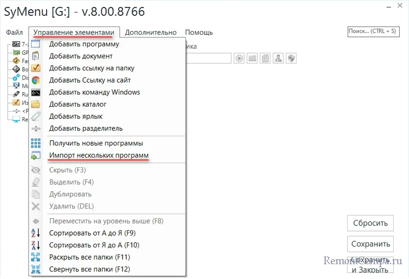 Если у вас, друзья, портативных программ много, можете добавить их в меню SyMenu за раз, путём их импорта. В разделе настроек «Управление элементами» выбираем «Импорт нескольких программ».