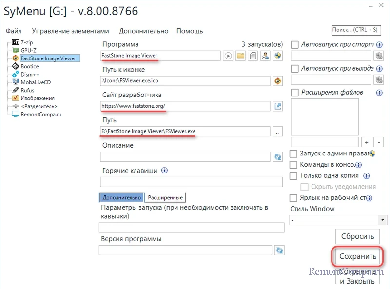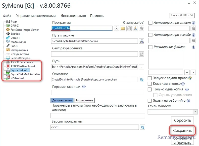 Выбрав объект меню, вносим его данные, они будут отличаться в зависимости от типа объекта. Больше всего данных предусматривается для портативных программ. Для них можно внести описание, версию, горячие клавиши запуска, настроить автозапуск при загрузке Windows или входе в учётную запись, настроить запуск с правами администратора и т.п. Все эти моменты можно упустить, обязательные графы для заполнения – название программы и путь к её файлу запуска. Можем также указать сайт разработчика, чтобы удобно было проверять обновления программы. По итогу внесения данных всех объектов меню жмём «Сохранить».