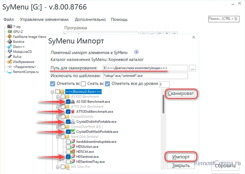 В графе «Путь для сканирования» указываем путь к папке с портативными программами. Жмём «Сканировать». В результатах сканирования устанавливаем галочки на файлах запуска программ, которые хотим видеть в меню SyMenu. Жмём «Импорт».
